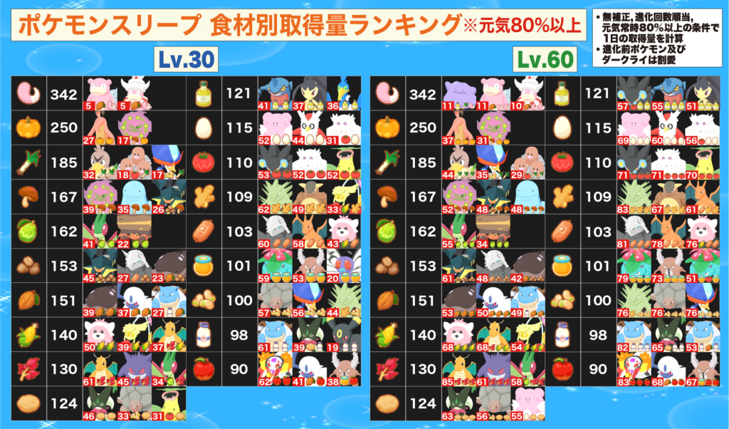 ※表については RaenonX様 , ポケモンスリープ攻略様 , Pokemon Sleep 攻略・検証wiki様などを参照
